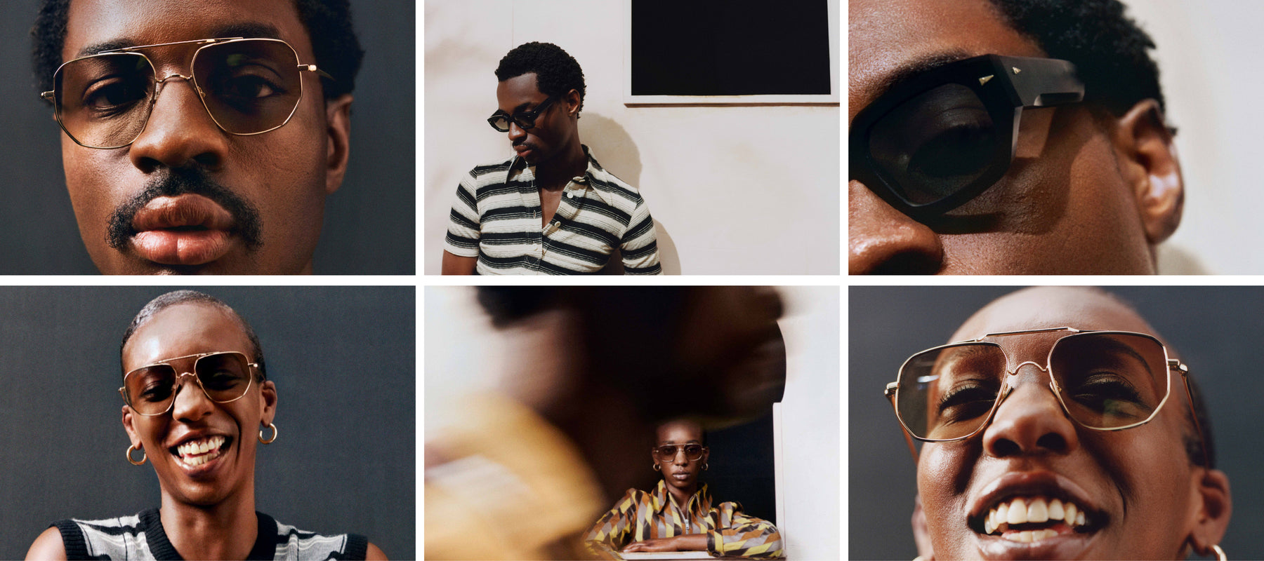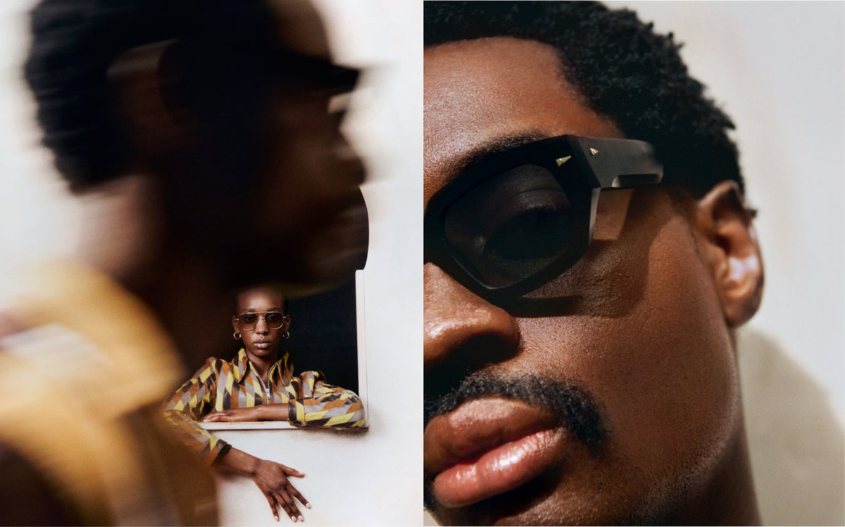 When I met Ahlem, I was thinking a lot about duality. Every time I'm written up, I get that tagline: “Black British-Ghanaian artist.” I was trying to understand what the hyphen was, and I just erased it. I wanted the frames to be another reflection of self. I remember seeing a lot of images from Malick Sidibé, James Barnor, Kwame Brathwaite, even my own grandparents’ photos of the swinging 1950s and ’60s in Ghana, and looking at how chic all the glasses were. With those pictures, I had all of these amazing West African references to lean into.